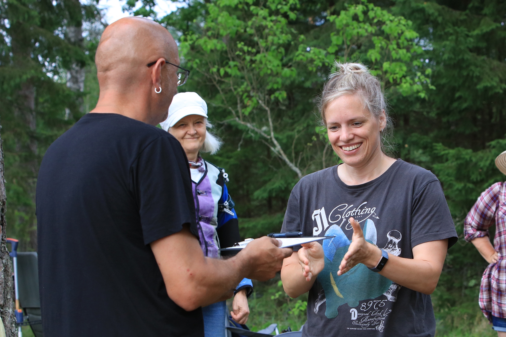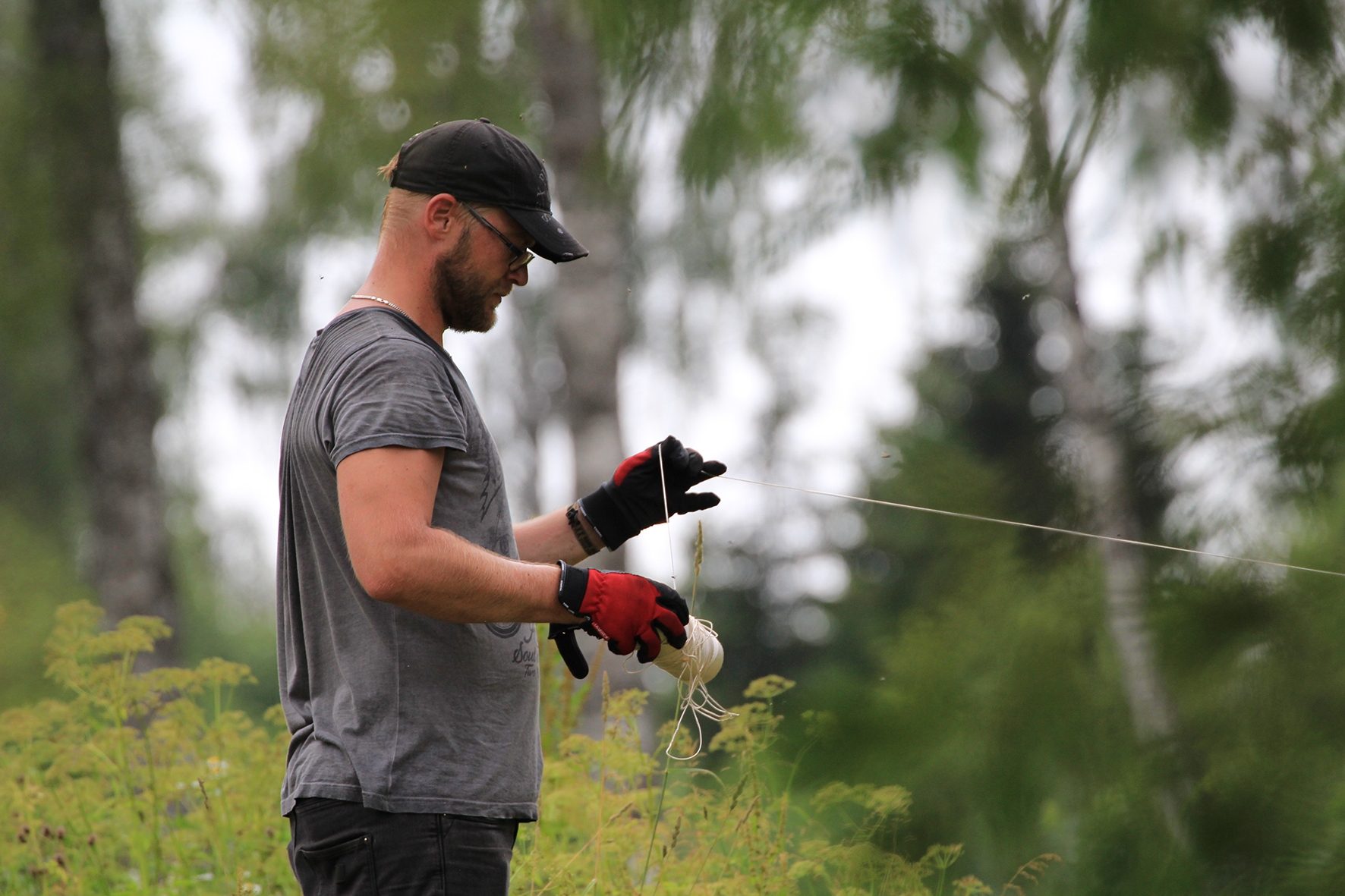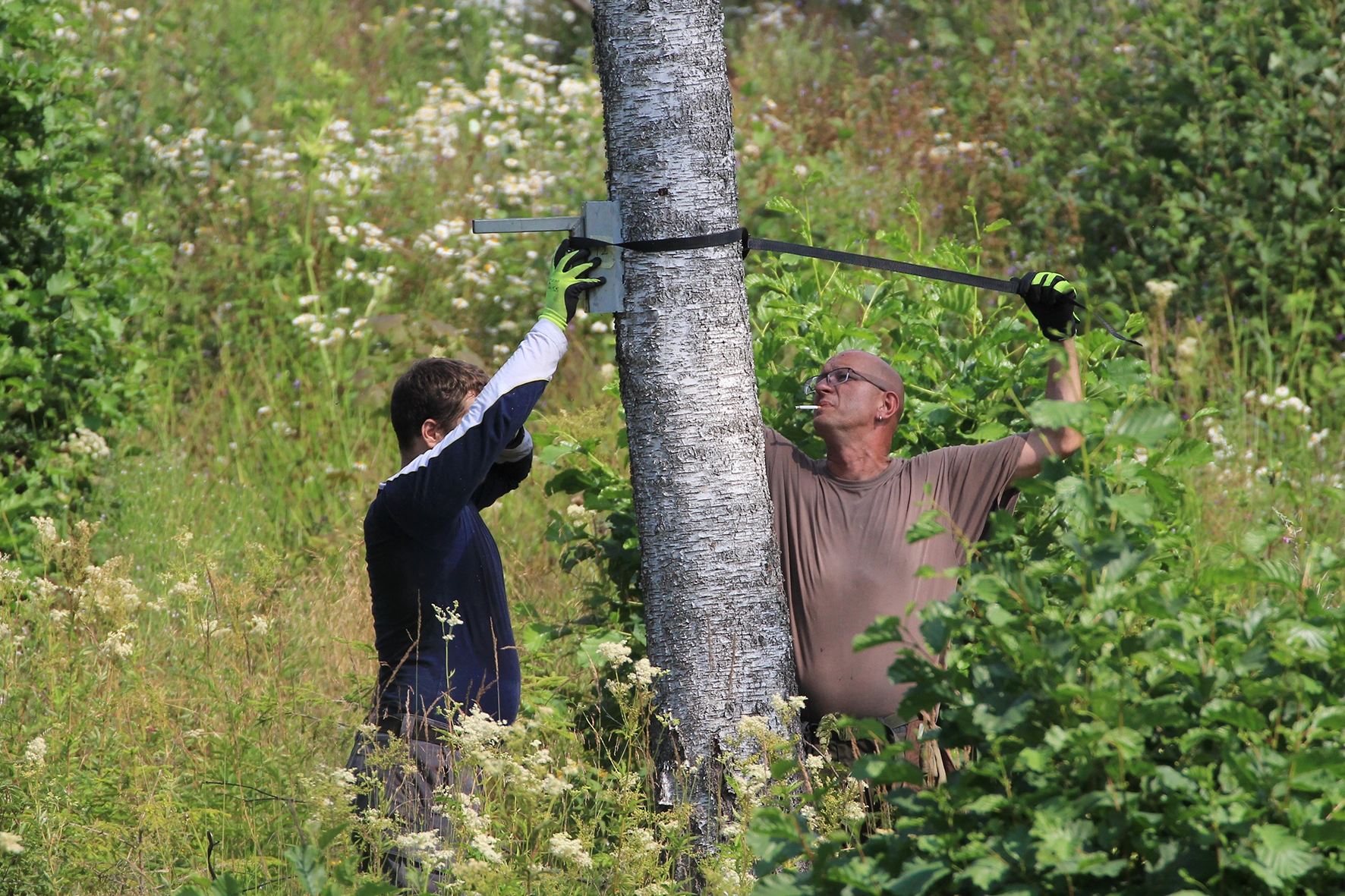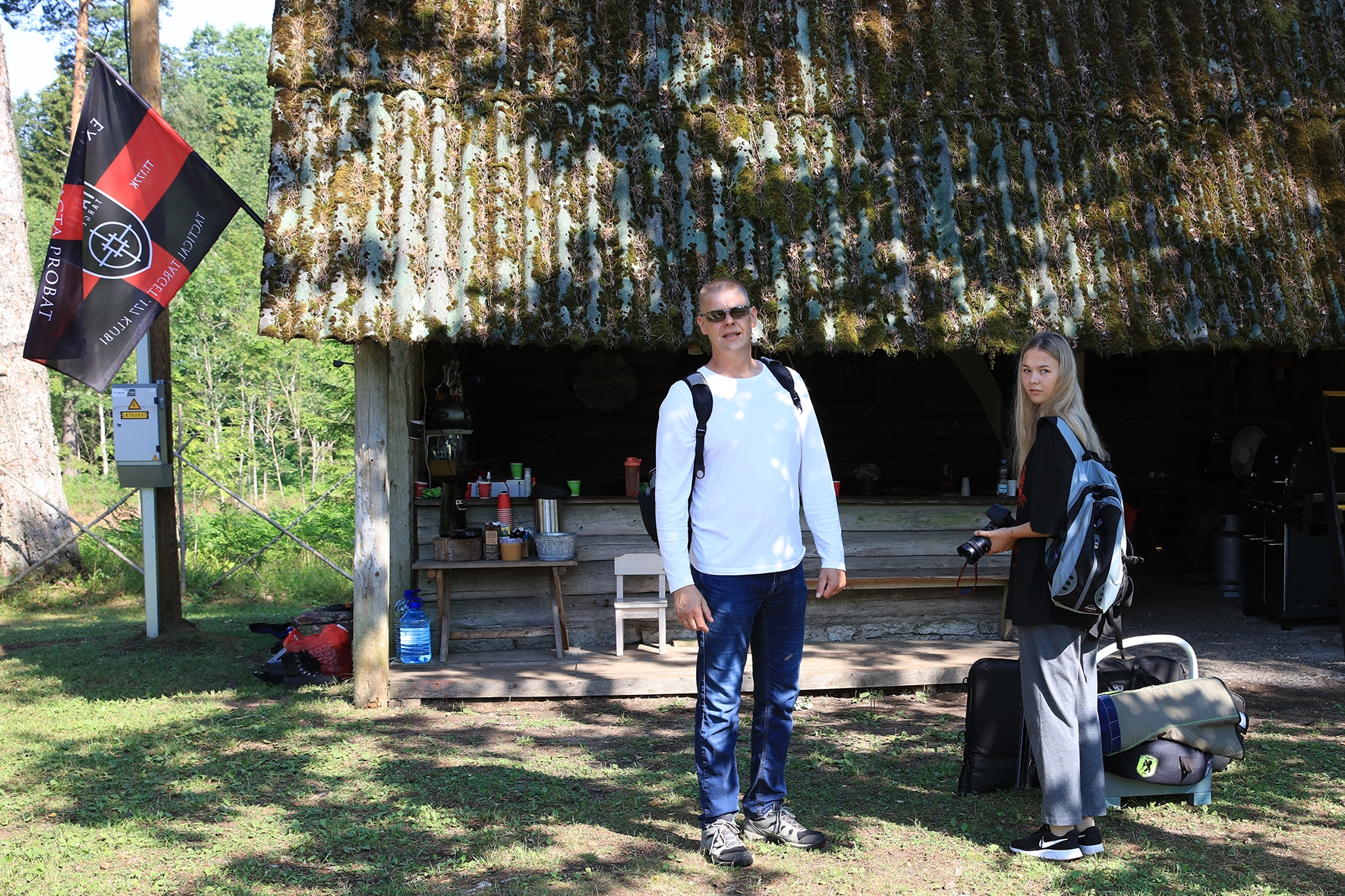 Vahepeal kuivanud riided olid uuesti märjad. Mereväelane Taavi ja Karl Erik rajasid sekstandi ning teiste täppisriistade abiga Zero Range väljakut. Ka seal oli palav. Tunnid möödusid ja rajad valmisid. Samal ajal, kui meie panime märke üles, korjas Jane magustoitude jaoks metsmaasikaid. Suvetaevasse hakkas kogunema igavaid pilvi 🙂 Viimastele radadele märkide panemisel hakkas sadama. Mitte natukene, vaid terve päeva vihmakogus tuli alla umbes paarikümne minutiga. Mitte ühtegi kuiva kohta enam polnud, kuid veel kolm rada ootasid lõpetamist. Neist kõige keerulisemale oli vaja tõmmata redel nii pikaks kui sai ja siis mööda seda koos märgiga krabinal kuuse otsa jõuda. Oli hirmus ja ohtlik, kuid see märk sinna sai 🙂