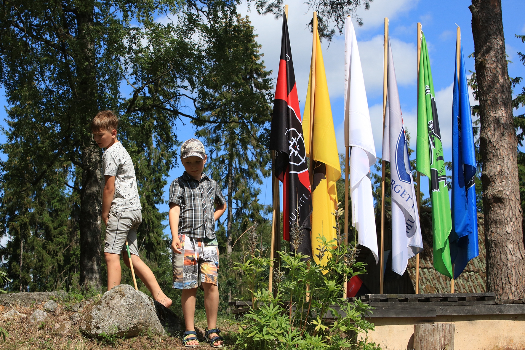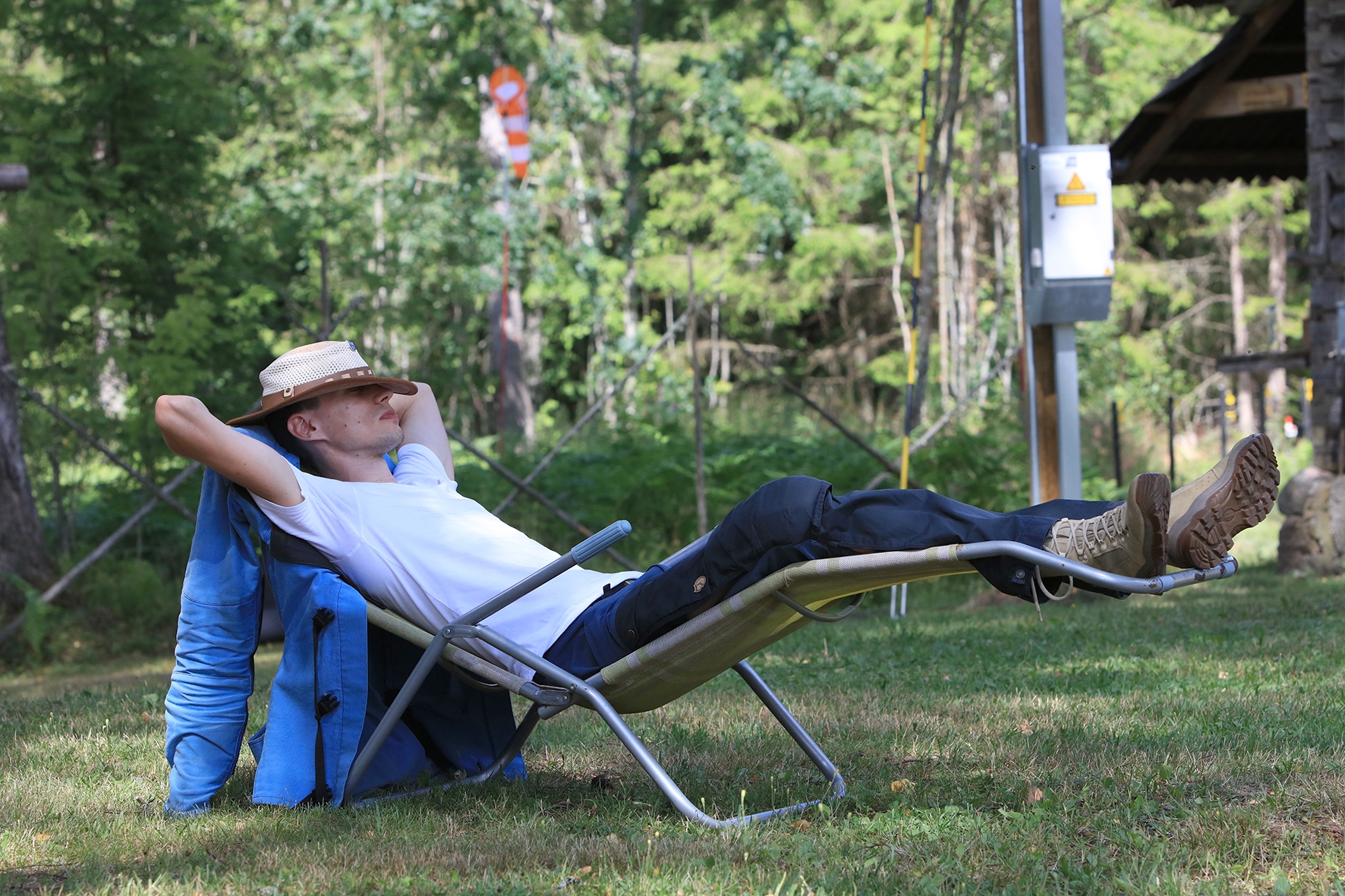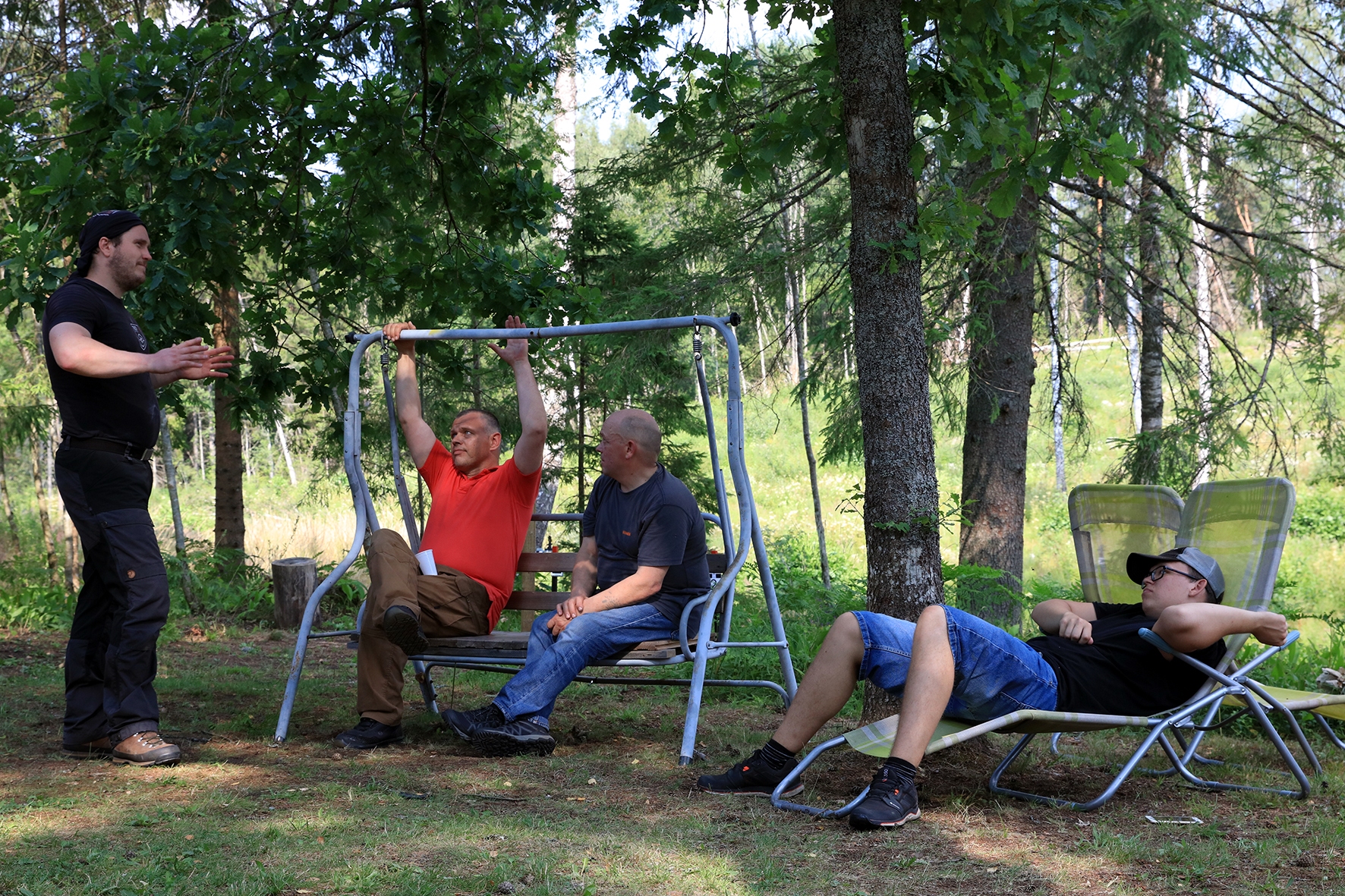 Vahepeal kuivanud riided olid uuesti märjad. Mereväelane Taavi ja Karl Erik rajasid sekstandi ning teiste täppisriistade abiga Zero Range väljakut. Ka seal oli palav. Tunnid möödusid ja rajad valmisid. Samal ajal, kui meie panime märke üles, korjas Jane magustoitude jaoks metsmaasikaid. Suvetaevasse hakkas kogunema igavaid pilvi 🙂 Viimastele radadele märkide panemisel hakkas sadama. Mitte natukene, vaid terve päeva vihmakogus tuli alla umbes paarikümne minutiga. Mitte ühtegi kuiva kohta enam polnud, kuid veel kolm rada ootasid lõpetamist. Neist kõige keerulisemale oli vaja tõmmata redel nii pikaks kui sai ja siis mööda seda koos märgiga krabinal kuuse otsa jõuda. Oli hirmus ja ohtlik, kuid see märk sinna sai 🙂