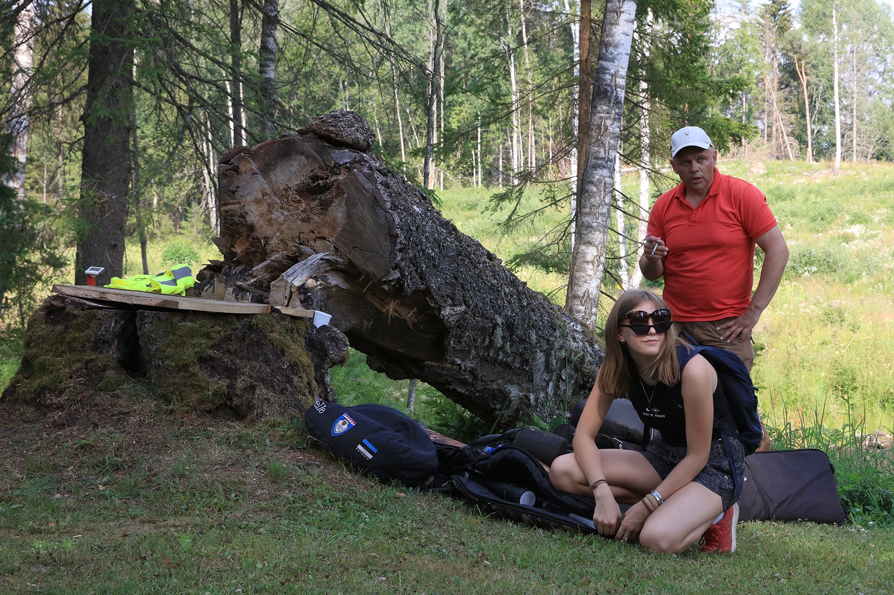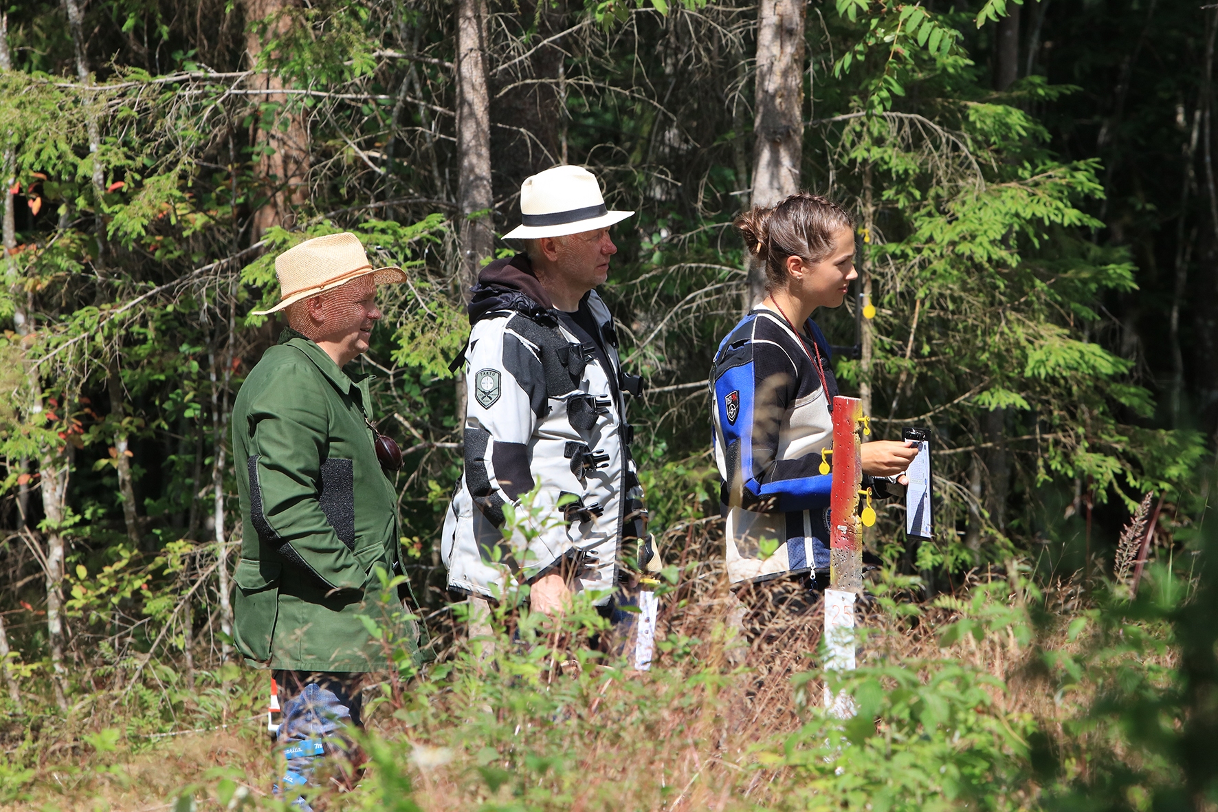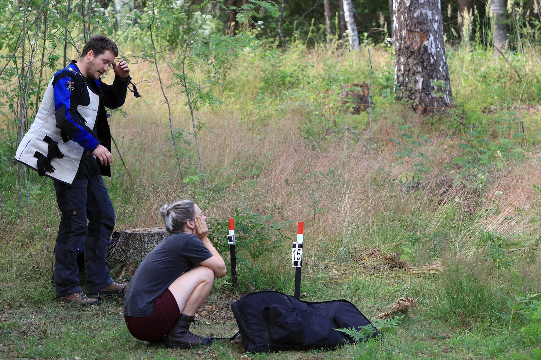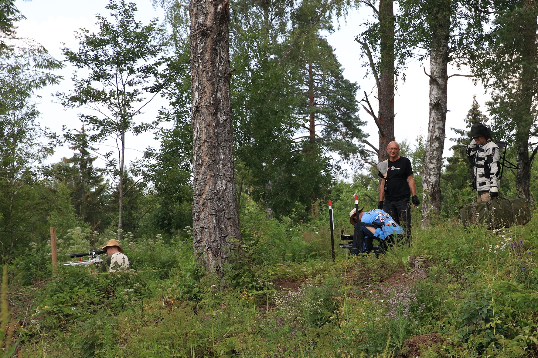 Loomulikult hakkas terve juuni kuiv ja päikeseline ilm enne võistlust iseloomu näitama. Siiski oli lootust kaks võistluspäeva kuiva nahaga teha. Reedeks lubas prognoos pisut vihma, kuid ei midagi erilist 🙂 Selge see, et sellist juttu ei maksa liiga tõsiselt võtta. Hommikuses kastemärjas metsas puudele märgikinnitusi pannes said riided esimest korda märjaks. Päev veeres ja temperatuur muudkui tõusis. Hilisema ärkamisega suuremad parmud jõudsid ka lõpuks kohale 🙂 Metsavilus oli veel siiski normaalne, kuid ees ootas meid soine padrik, kuhu oli vaja enamus sihtmärke paigaldada. Aastaga on raiesmik kattunud võsaga, see tähendas seda, et lisaks märkidele tuli ka ca neljameetrist redelit kaasa vedada. Soine pinnas auras, õhk ei liikunud ja oli parmudest paks.
