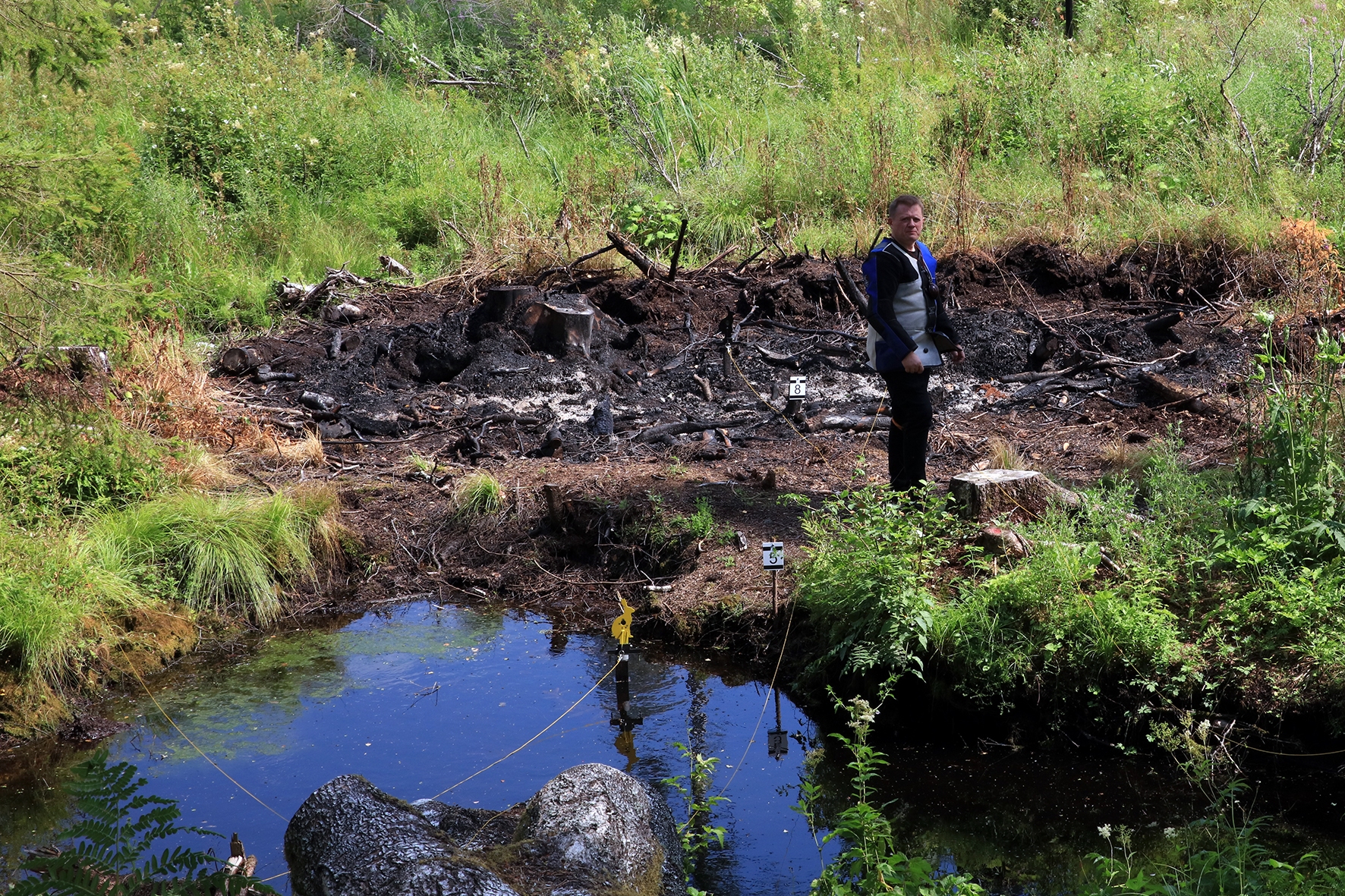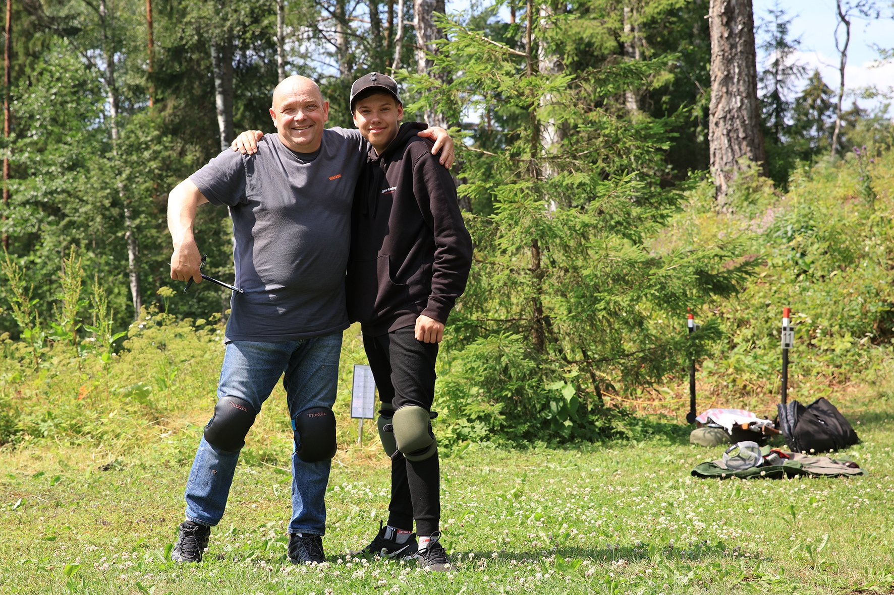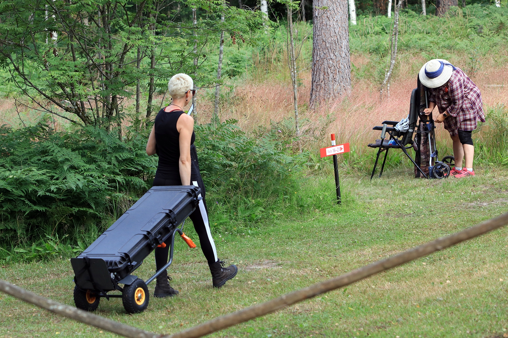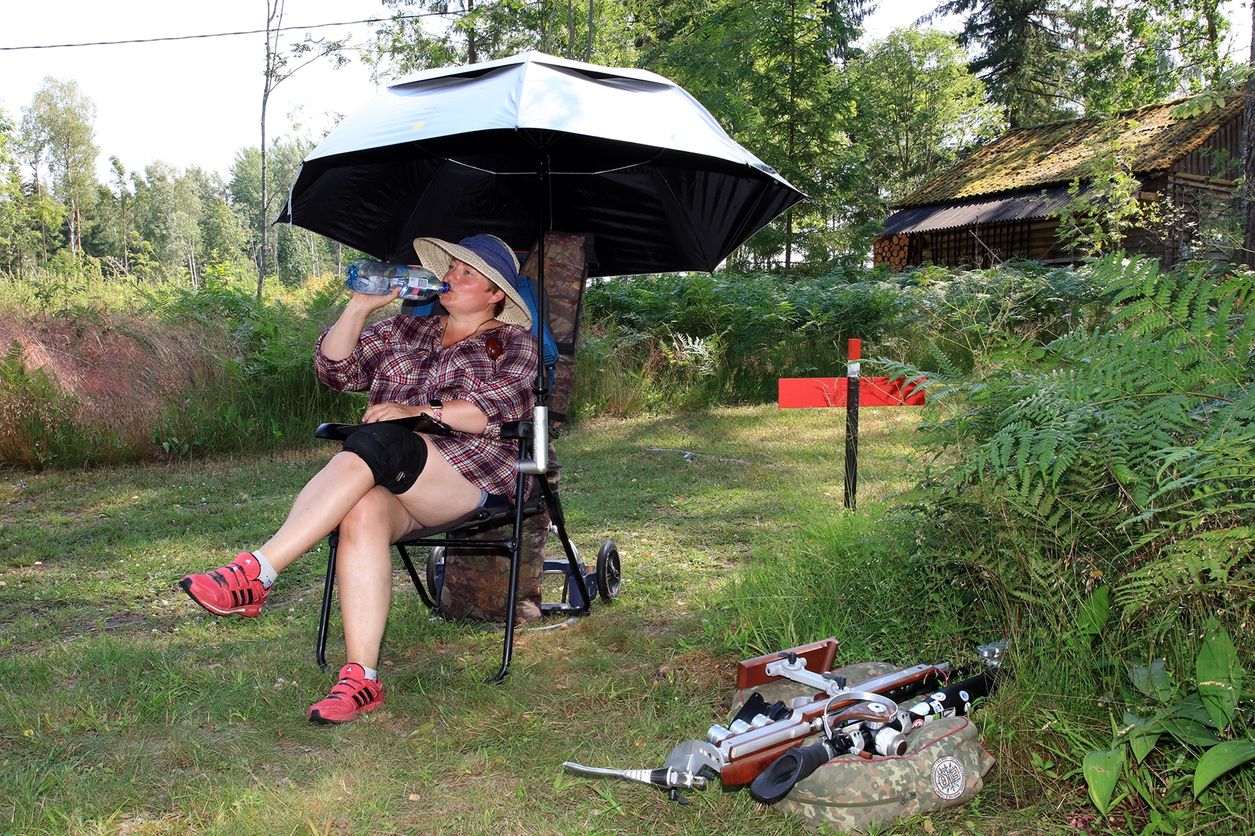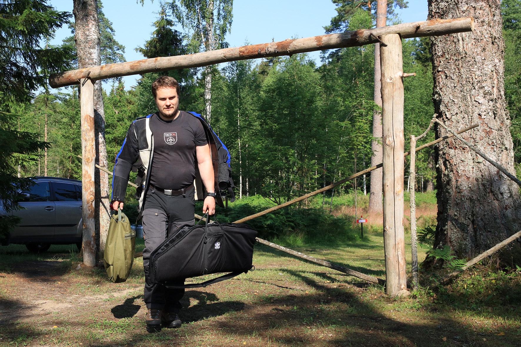 Loomulikult hakkas terve juuni kuiv ja päikeseline ilm enne võistlust iseloomu näitama. Siiski oli lootust kaks võistluspäeva kuiva nahaga teha. Reedeks lubas prognoos pisut vihma, kuid ei midagi erilist 🙂 Selge see, et sellist juttu ei maksa liiga tõsiselt võtta. Hommikuses kastemärjas metsas puudele märgikinnitusi pannes said riided esimest korda märjaks. Päev veeres ja temperatuur muudkui tõusis. Hilisema ärkamisega suuremad parmud jõudsid ka lõpuks kohale 🙂 Metsavilus oli veel siiski normaalne, kuid ees ootas meid soine padrik, kuhu oli vaja enamus sihtmärke paigaldada. Aastaga on raiesmik kattunud võsaga, see tähendas seda, et lisaks märkidele tuli ka ca neljameetrist redelit kaasa vedada. Soine pinnas auras, õhk ei liikunud ja oli parmudest paks.