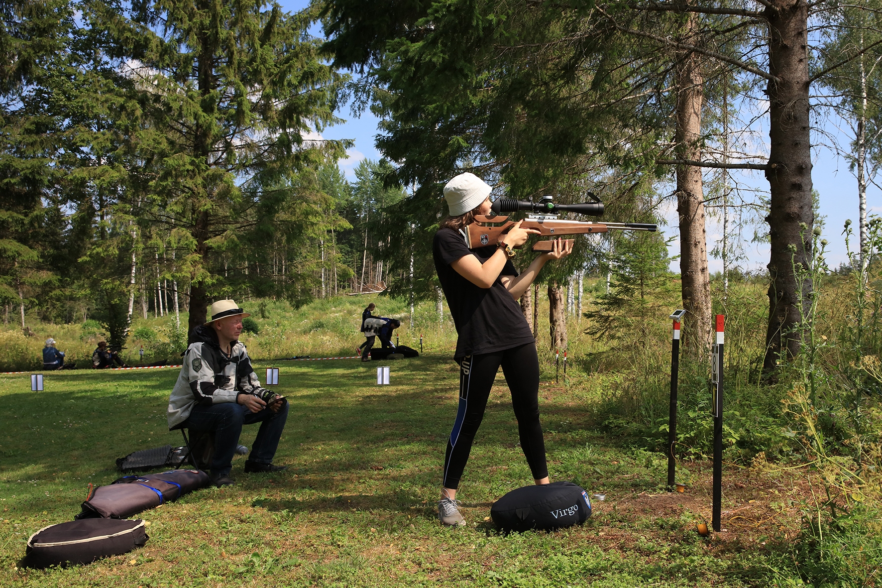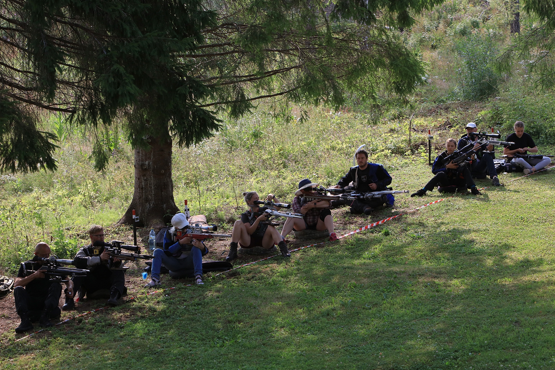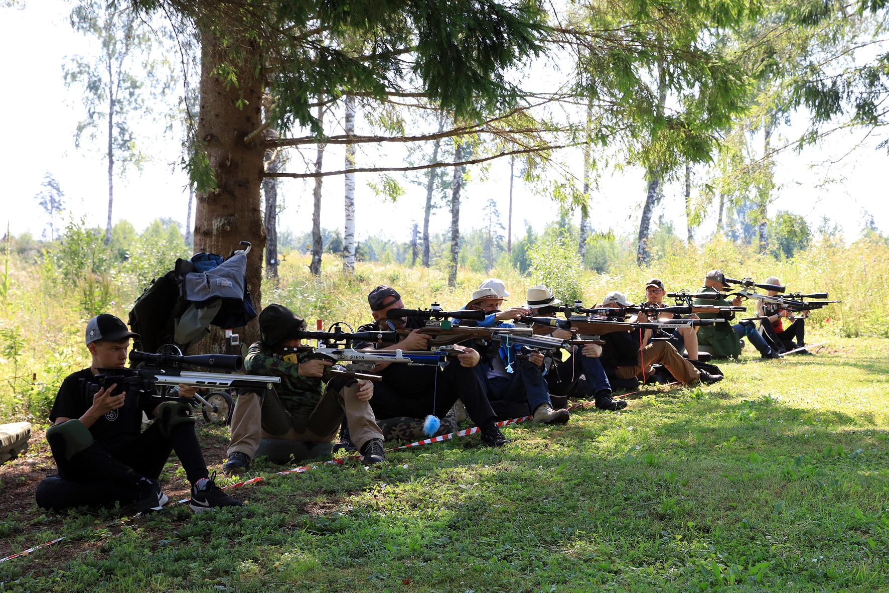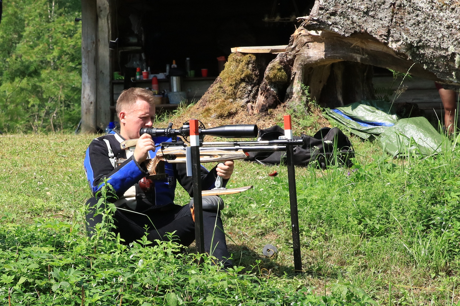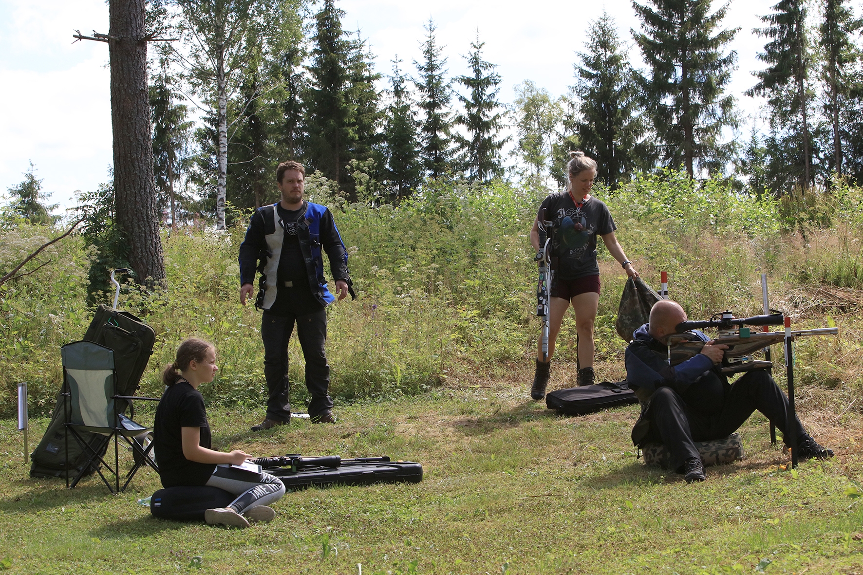 Võistlus algas. Laskurid lasid sihtmärke ning võitlesid palavuse ja putukatega. Päike paistis, temperatuur tõusis, optikad tegid trikke, kuid võistlus sujus. Keset sellist idülli kõlas kohtuniku vile – „Tuli seis!”. Selgus, et üks kukk oli kinni kiilunud 🙂 Kohtunik Toomas eemaldas oksa ning võistlus jätkus. Saabus esimese võistluspäeva lõpp. Laskureid ootas ees seljanka ning üllatusmagustoit metsmaasikatega.