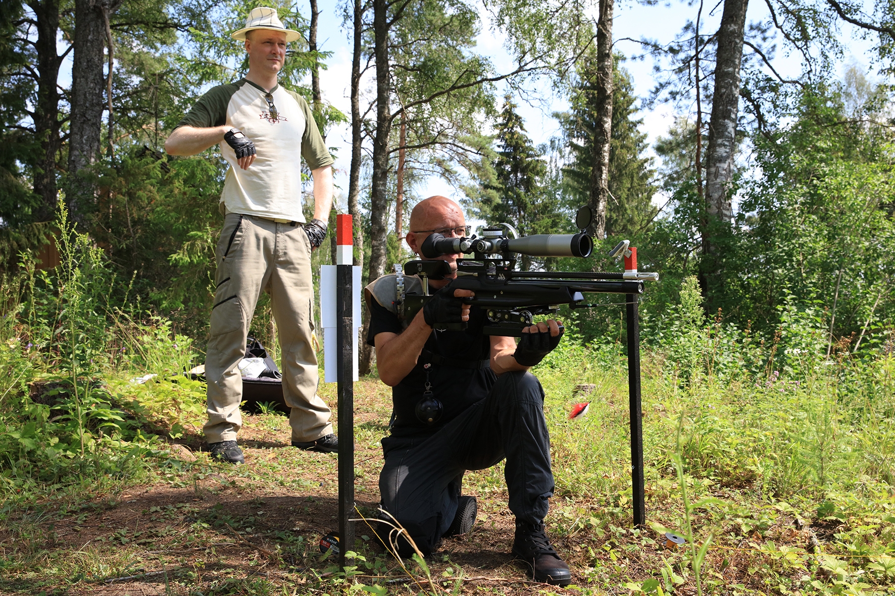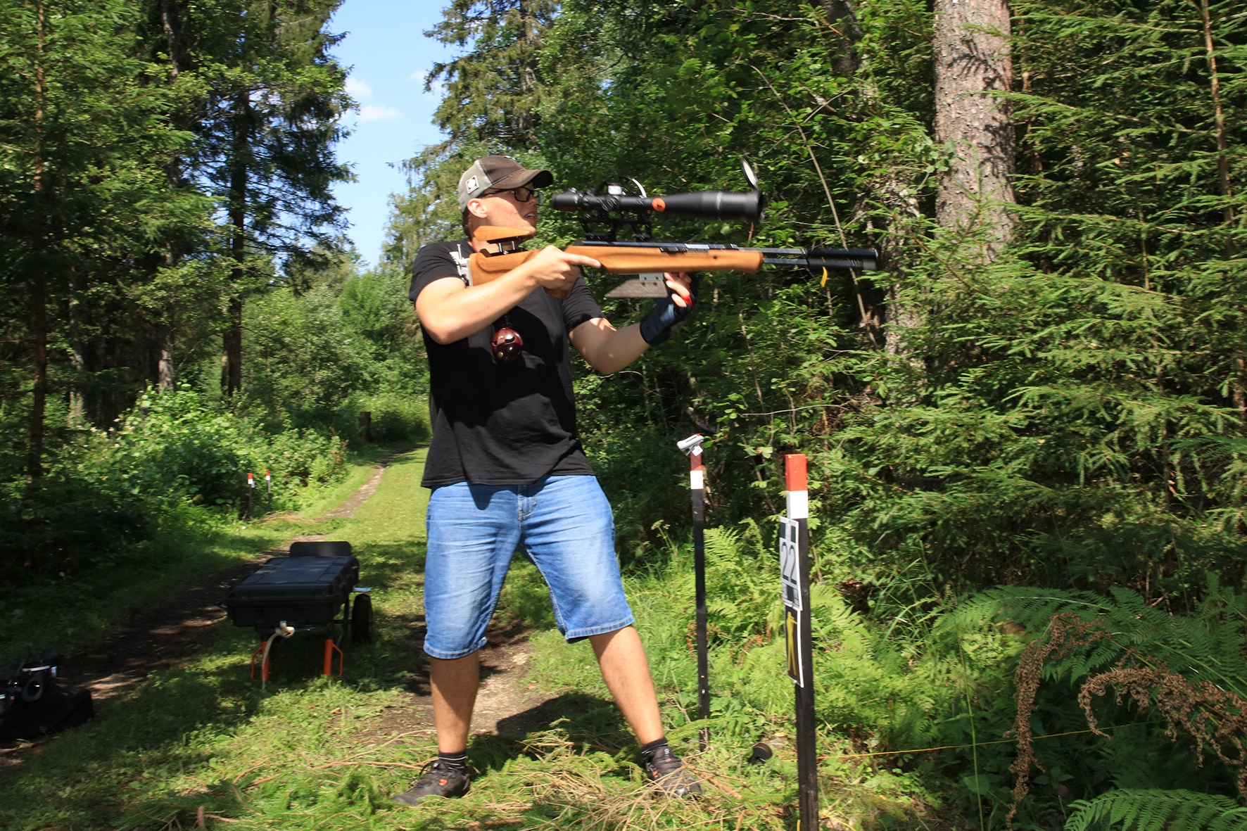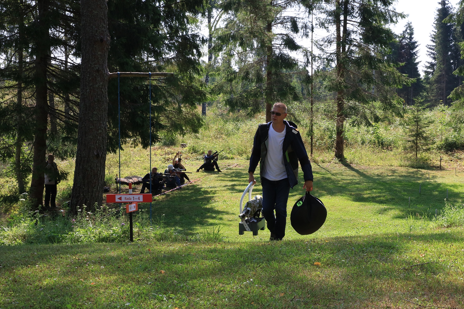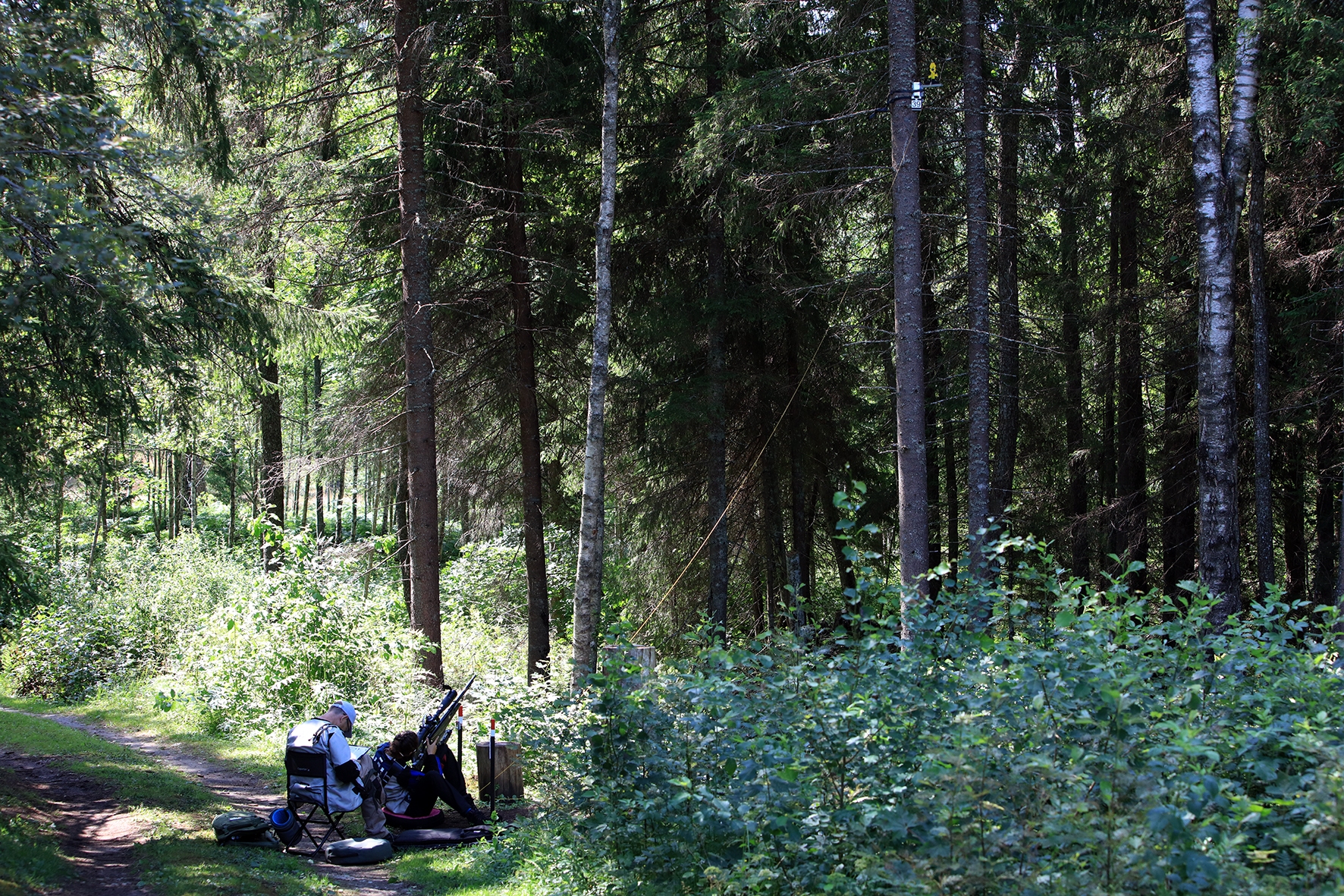 Võistlus algas. Laskurid lasid sihtmärke ning võitlesid palavuse ja putukatega. Päike paistis, temperatuur tõusis, optikad tegid trikke, kuid võistlus sujus. Keset sellist idülli kõlas kohtuniku vile – „Tuli seis!”. Selgus, et üks kukk oli kinni kiilunud 🙂 Kohtunik Toomas eemaldas oksa ning võistlus jätkus. Saabus esimese võistluspäeva lõpp. Laskureid ootas ees seljanka ning üllatusmagustoit metsmaasikatega.