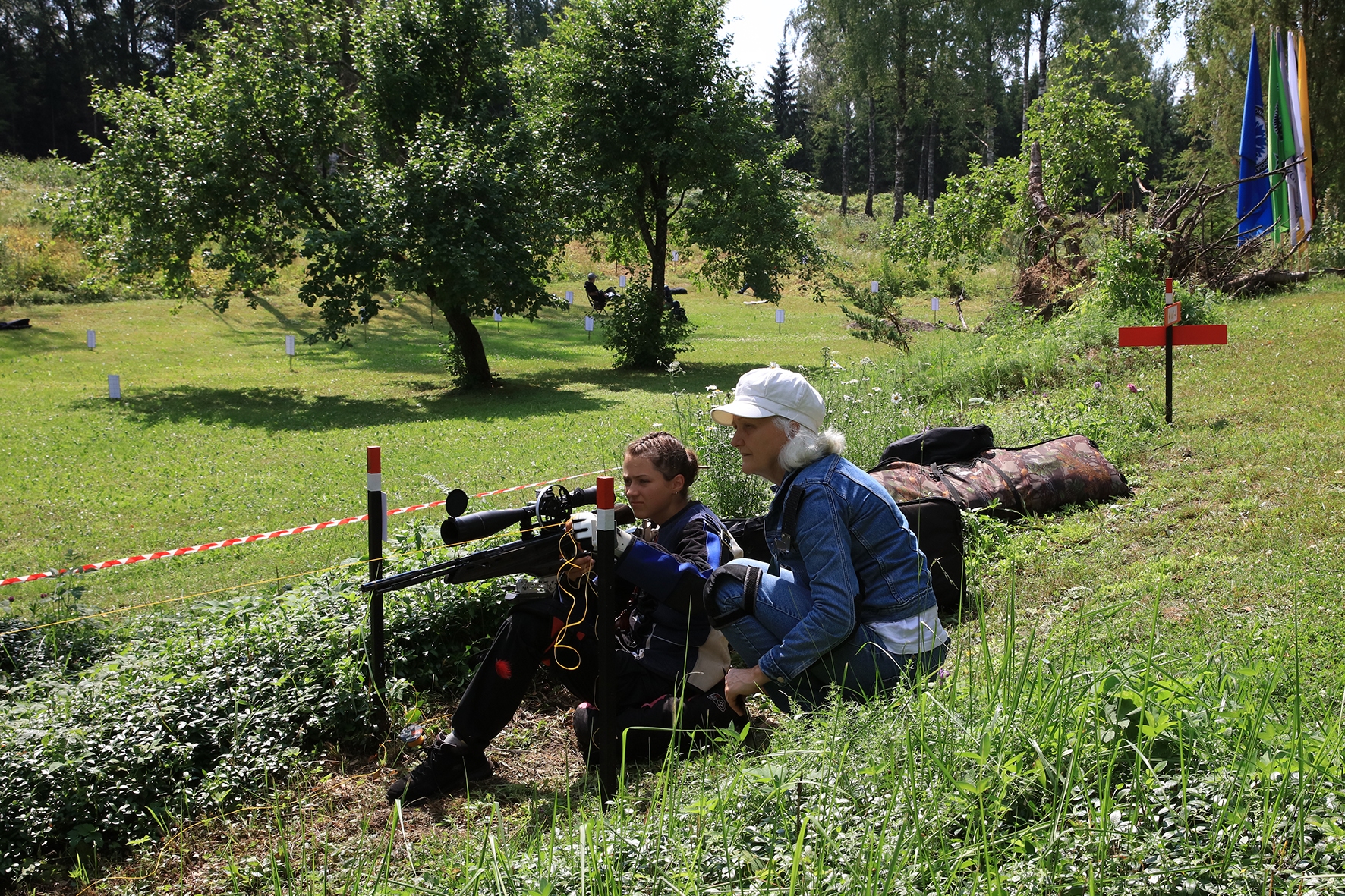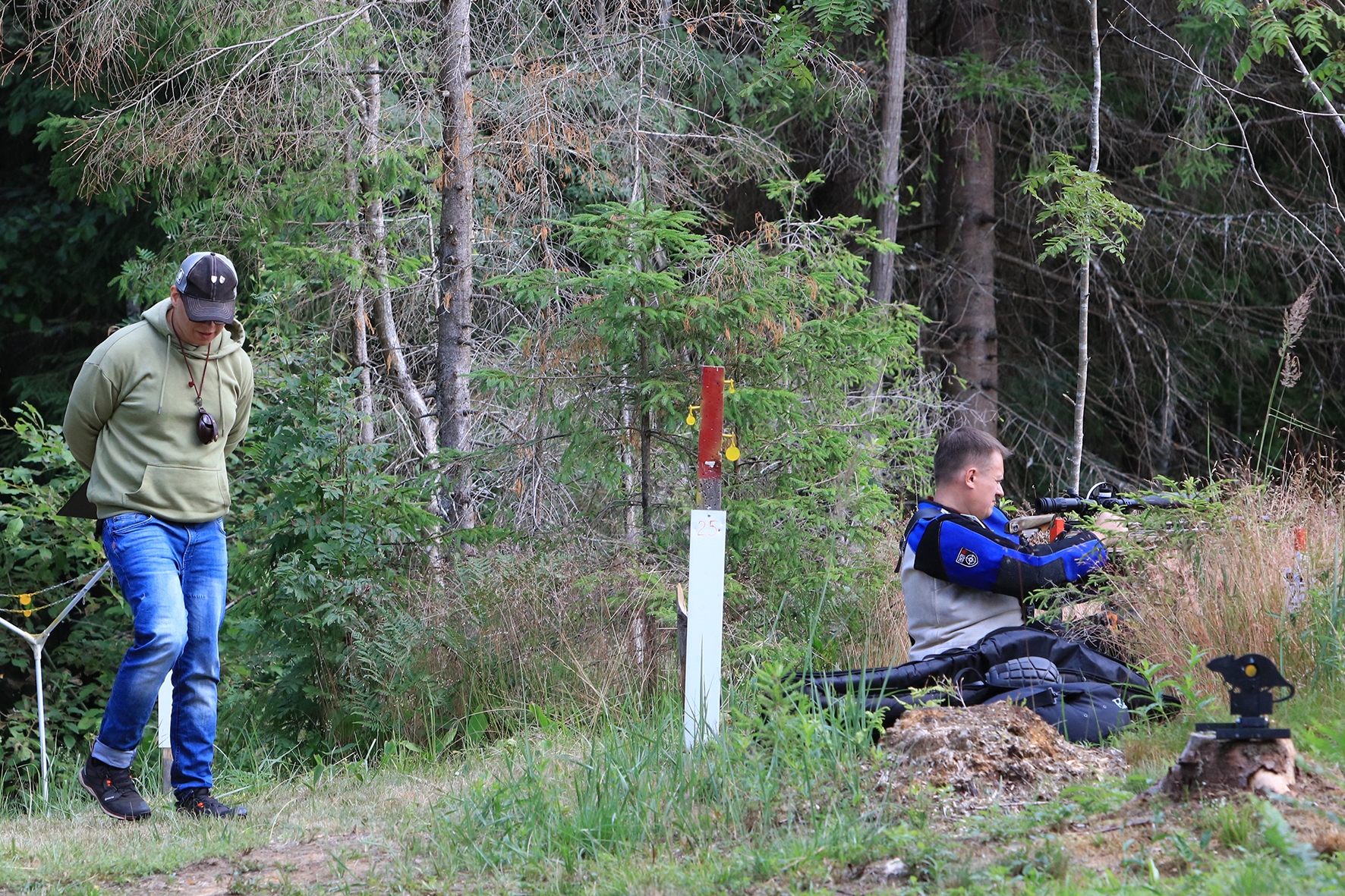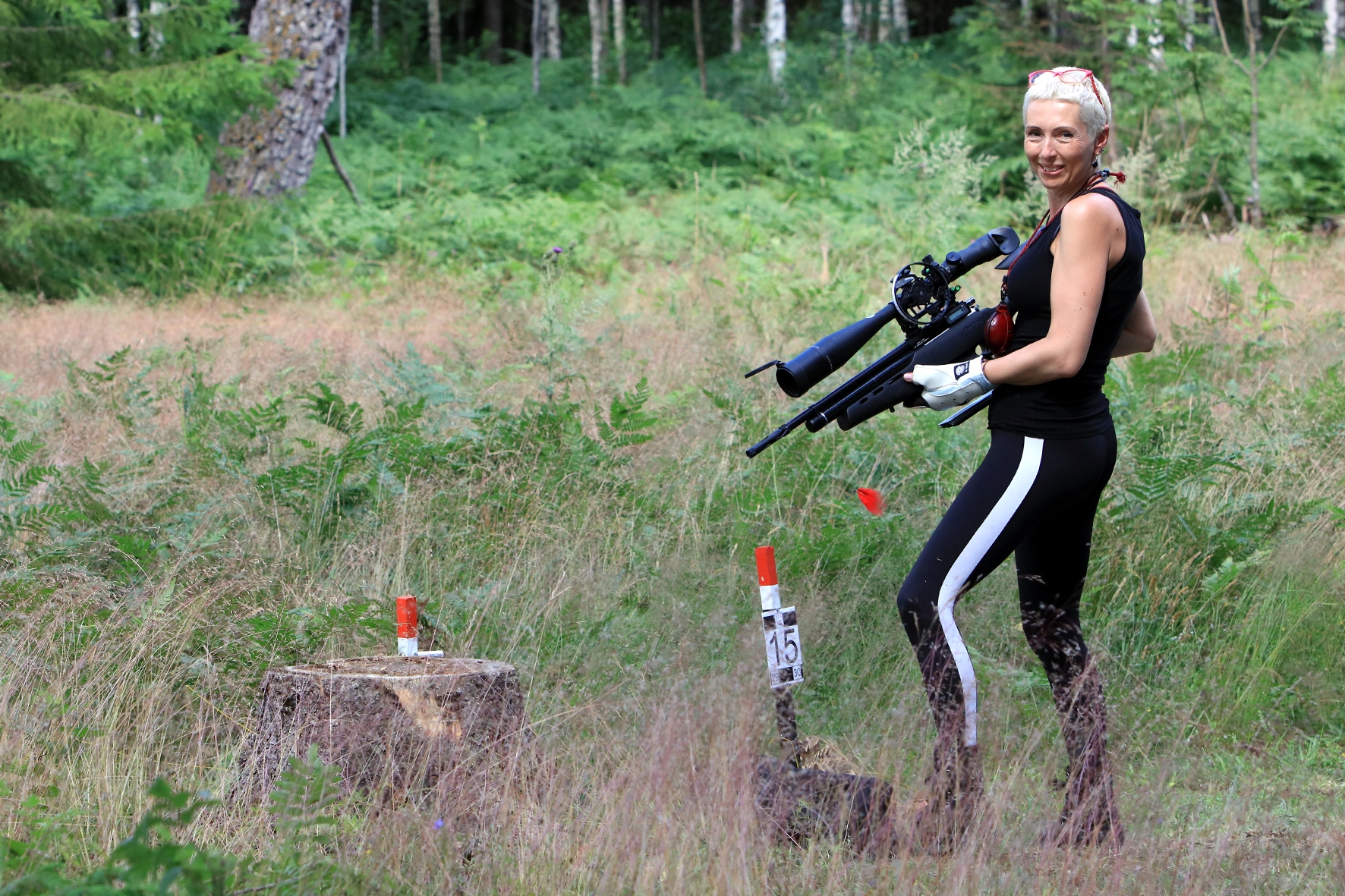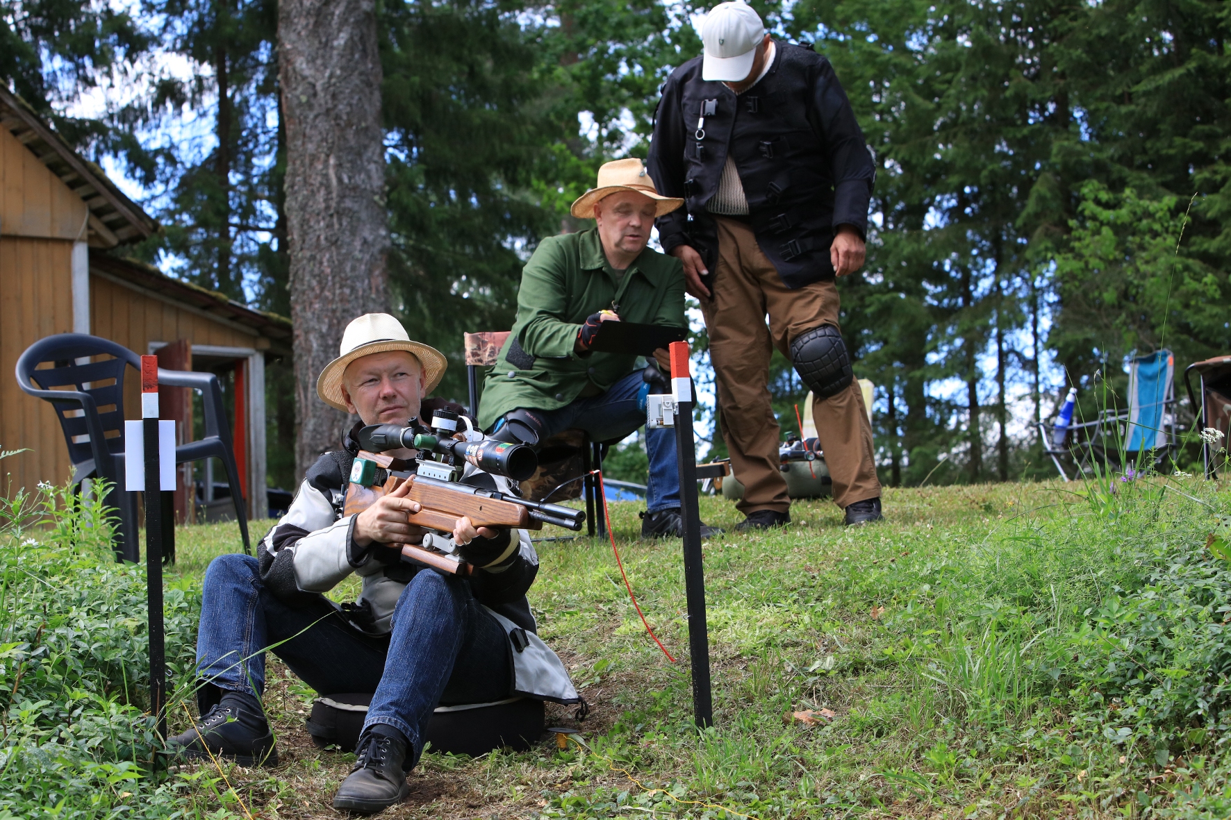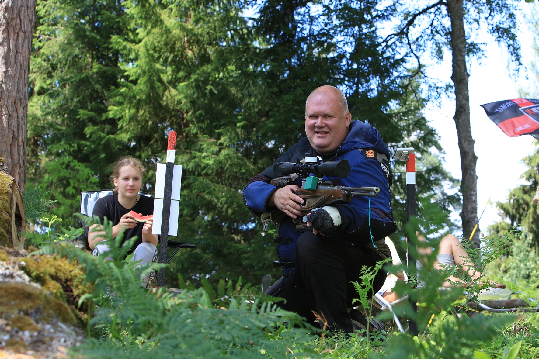 Võistlus algas. Laskurid lasid sihtmärke ning võitlesid palavuse ja putukatega. Päike paistis, temperatuur tõusis, optikad tegid trikke, kuid võistlus sujus. Keset sellist idülli kõlas kohtuniku vile – „Tuli seis!”. Selgus, et üks kukk oli kinni kiilunud 🙂 Kohtunik Toomas eemaldas oksa ning võistlus jätkus. Saabus esimese võistluspäeva lõpp. Laskureid ootas ees seljanka ning üllatusmagustoit metsmaasikatega.